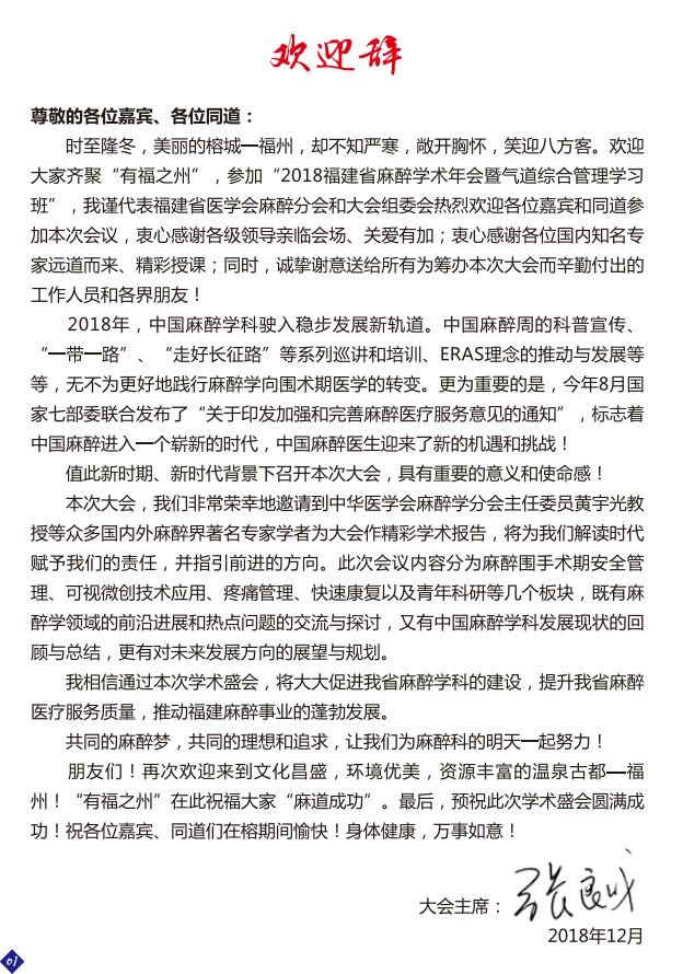 时至隆冬,美丽的榕城——福州,却不知严寒,敞开胸怀,笑迎八方来客!2018年12月7日-9日,由福建省医学会、福建医科大学附属协和医院主办,福建省医学会麻醉学分会、福建医科大学附属协和医院麻醉科承办的2018年福建省麻醉学术年会暨气道综合管理学习班在这里隆重举办!