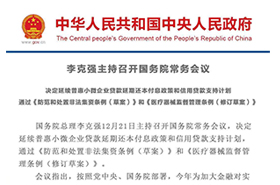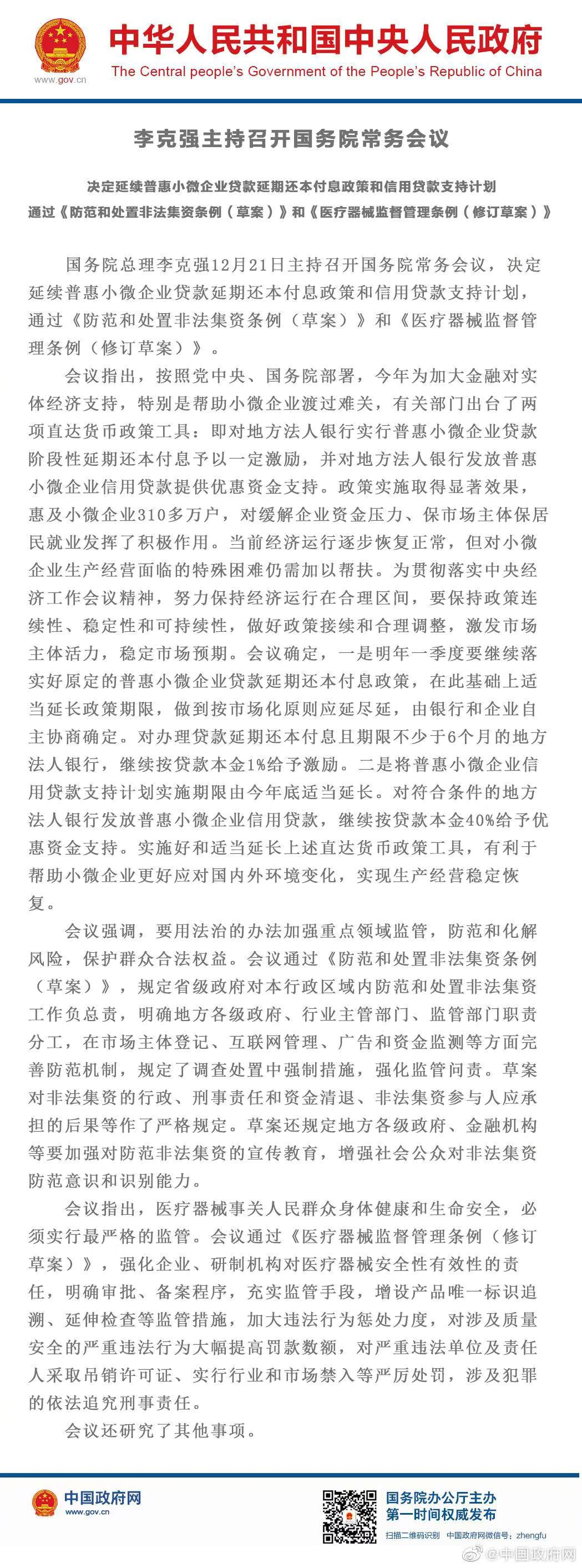 国务院总理李克强12月21日主持召**国务院常务会议,决定延续普惠小微企业贷款延期还本付息政策和信用贷款支持计划,通过《防范和处置非法集资条例(草案)》和《医疗器械监督管理条例(修订草案)》。